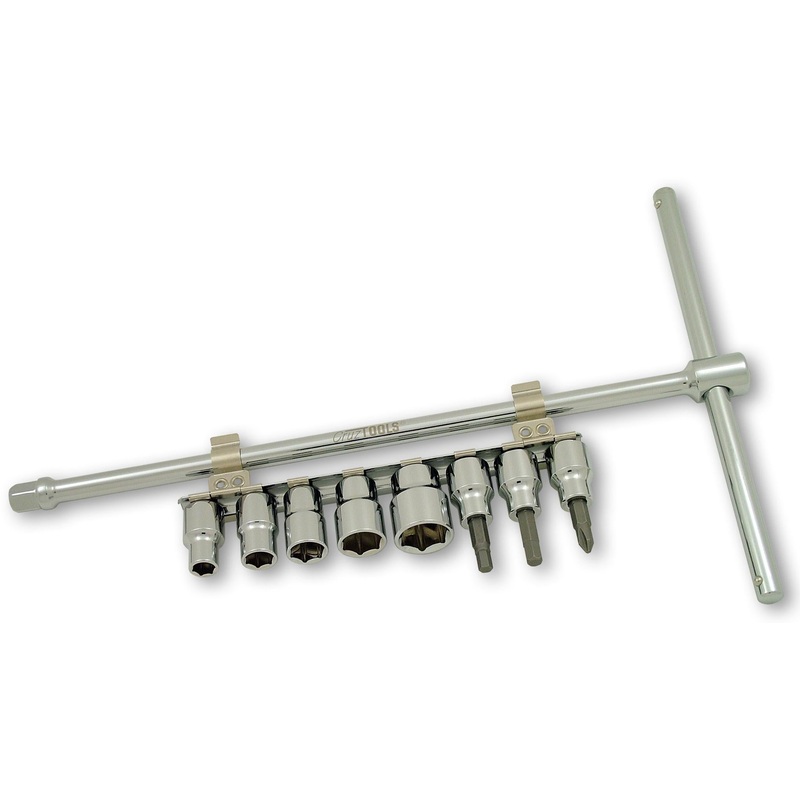 PowerDrive Sliding T-handle combo featuresa 3/8in drive tip and set of eight sockets that should take care of just about any operation. Includes: 8, 10, 12, 14, and 17mm sockets; 5 and 6mm hex bits; and a #2 Phillipsscrewdriver bit, all on a socket clip th