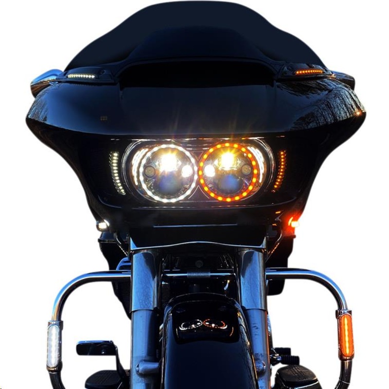 Come with aluminum housingsFour high-power white DRL LEDs, six high-power amber turn signal LEDsDOT/ SAE compliantAvailable in gloss black or chrome finishPlug-and-play for easy installationSold in pairs