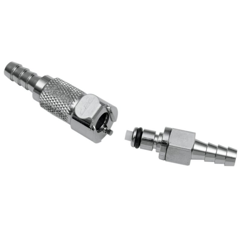 Durable die-cast body constructed from chrome-plated brassFeatures stainless springs, pin, latch, viton O-rings and acetal shutoff valvesBarbed hose ends provide simple attachment to common 3/16in., 1/4in., and 5/16in. hosesDouble shutoff valves prevent fu