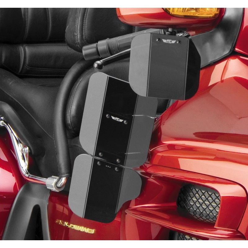 Wing Deflectors allow maximum temperature control of airflow toward or away from the rider. Fully road worthy; once adjusted they stay in place, even at highway speeds. Made from extra-tough hardcoated polycarbonate for outstanding impact strength. Unique