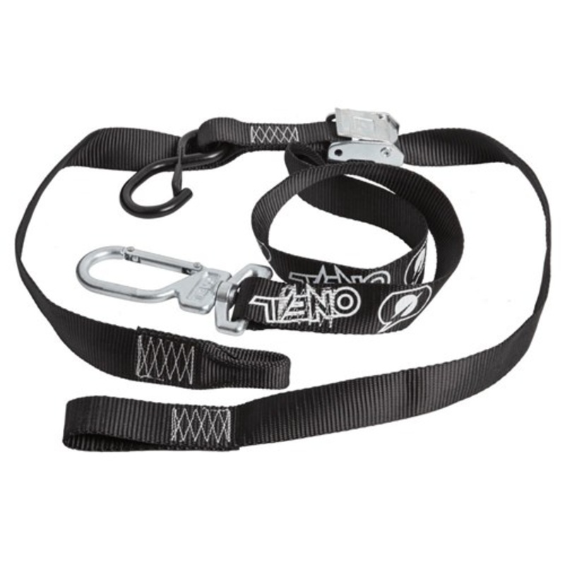 1 1/2 Wide Polyester webbing Double Security stitching 600lb working load limit 1,450lb Breaking strength Soft-Tye Sewn-In Non-Scratching, Fits in tight areas Swivel Carabiner hook with spring loaded safety latch Keeps your bike secure while transporting I