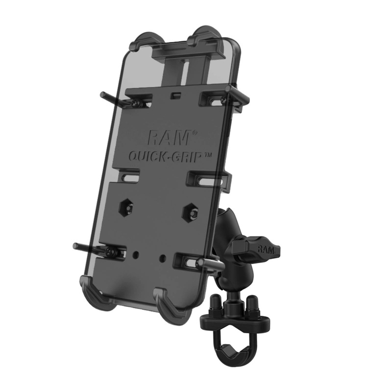 This version of the spring-loaded RAM Quick-Grip holder provides a secure fit for a variety of large phones and other devices. The adjustable side keepers ensure that devices like GPS units and Bluetooth speakers within the listed compatible dimensions will also fit in the holder. Included is a short RAM double socket arm and zinc-coated handlebar U-Bolt base that accommodates rails from 0.5 to 1.25 in diameter.